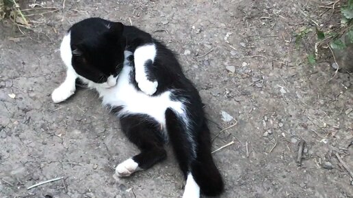 Дикий кот Борода лёжа моется: прям как в бане...