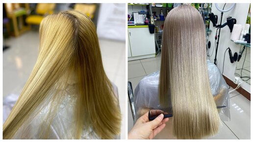 Жемчужный блонд из желтых волос за одно окрашивание - без обесцвечивания порошком и пастой. Осветление волос крем краской, без желтизны