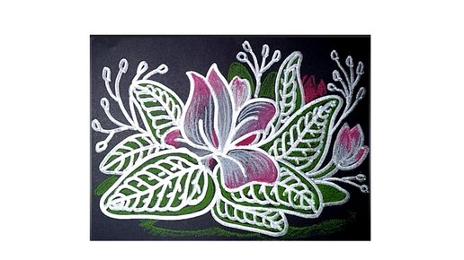 Розовый цветок нарисованный маркером металлик и цветными карандашами на черной бумаге.