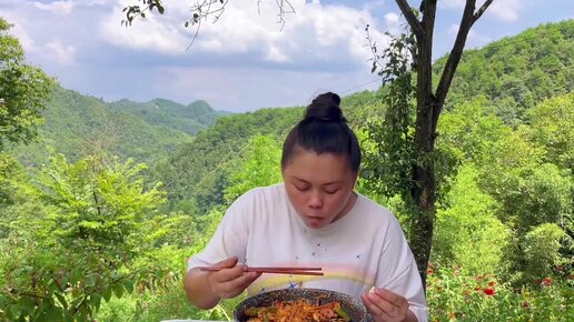 Соберите перец и черные помидоры, обжарьте их с лапшой, добавьте несколько куриных яиц, лапшу с большим ртом, острую и потную