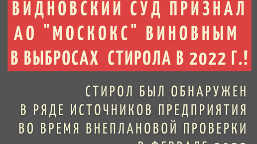 ВИДНОВСКИЙ ГОРОДСКОЙ СУД ПРИЗНАЛ АО "МОСКОКС" ВИНОВНЫМ В ВЫБРОСАХ СТИРОЛА В 2022 ГОДУ!