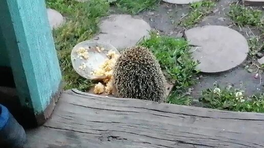 Смешной маленький ежик приходит каждый вечер к крыльцу, приходится его подкармливать