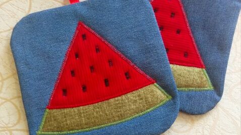 Август - время сочных арбузов. Решила себя порадовать и сшила новые прихватки с кусочками сладкой ягоды.