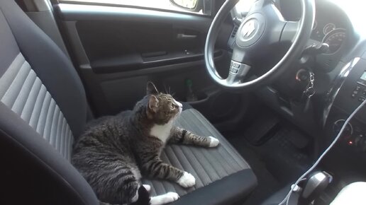 Кот Грунт сидит за рулем.