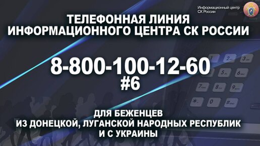 Горячая линия для беженцев из ДНР, ЛНР и с Украины Информационного центра СК России 8-800-100-12-60 (#6)