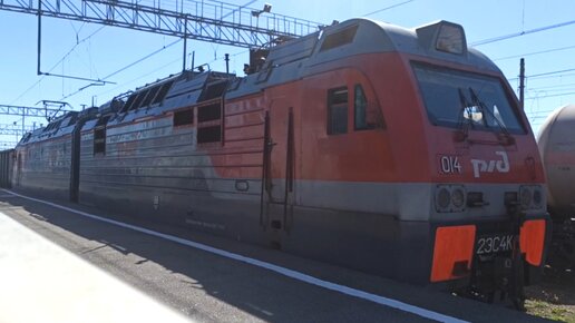 Грузовой поезд с электровозом 2ЭС4к - 014 и полувагонами