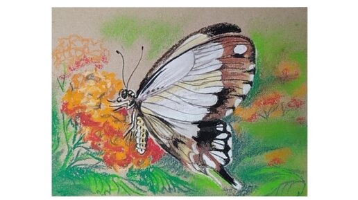 Бабочка на оранжевом цветке. Рисунок сухой пастелью на крафтовой бумаге.