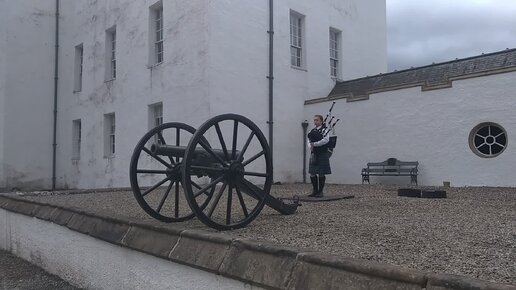 Играющая на волынке у замка шотландская девочка