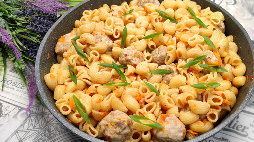 Быстрый ужин 2 в 1 за 20 минут. Макароны с фрикадельками в одной сковороде.
