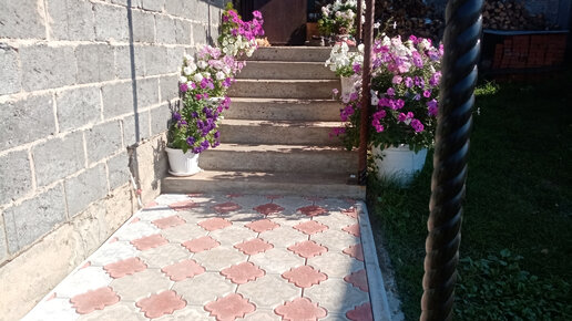 Катя красит волосы в фиолетовый. Обрезала помидоры. Плитка возле крыльца.