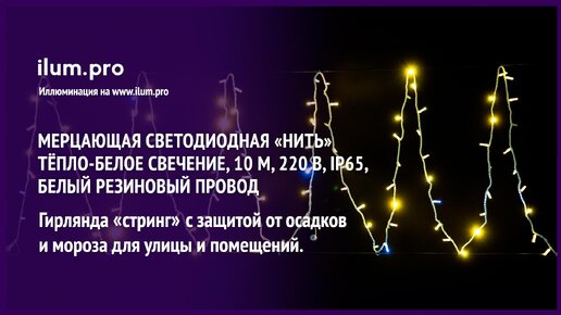 Мерцающая светодиодная «Нить» («Стринг») тёпло-белая, 10 м, 220 В, IP65, белая резина / Айлюм Про