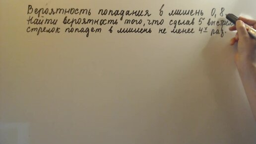 Вероятность попадания в мишень равна 0,8. Найдите вероятность того, что, сделав пять выстрелов стрелок попадет в мишень не менее 4 раз