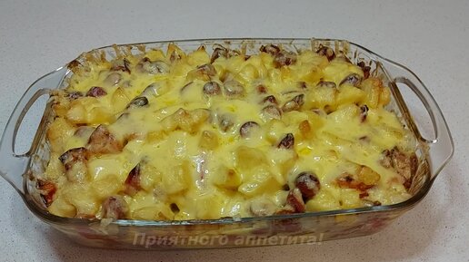 Не знаете, что придумать на ужин? Все уже придумано. Есть простой и вкусный рецепт – сочная картошка с сосисками и помидорами в духовке.