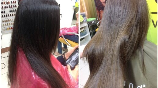 Декапирование / осветление темных волос и последующая коррекция цвета волос после обесцвечивания. Из черного в холодный русый.