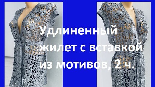 Удлиненный жилет с вставкой из мотивов, 2 ч. вязание крючком