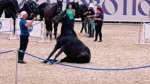 Репетиция номера с лошадьми РВП на свободе: свечки, команда "сидеть" и прыжки через скакалку
