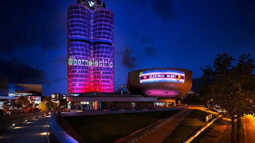 Лазерная иллюминация штаб-квартиры BMW в Мюнхене на тему 50-летия электромобилей. Посмотрите!