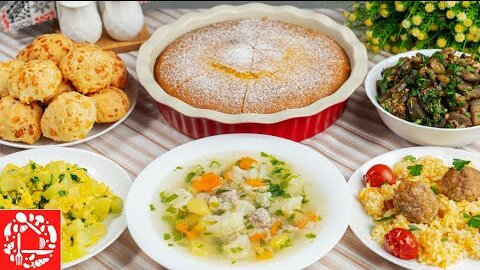 Меню на каждый день. Завтрак из яиц и кабачков, суп с цветной капустой, манник, тефтели и салат