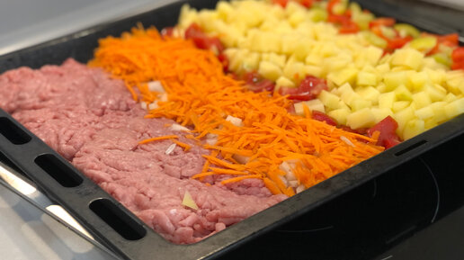 Полоски из фарша и овощей на противне. Нарезать,перемешать и в духовку убрать. Самый быстрый и ленивый ужин, который не нужно охранять и у плиты стоять)