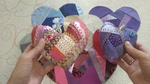 Лоскутную работу на лето почти закончила делать. Декоративные сердечки в технике Крейзи-Квилт. Делюсь результатом.
