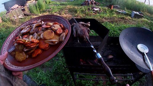 Картофель по китайски на мангале с уткой. Готовим на природе у реки на садже на мангале.