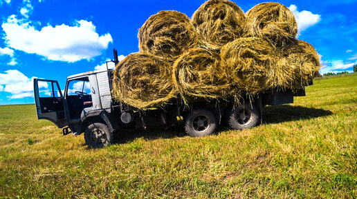 Один день сенокоса 2022 года. Вывозим с поля сено в рулонах на Камазах и Урале