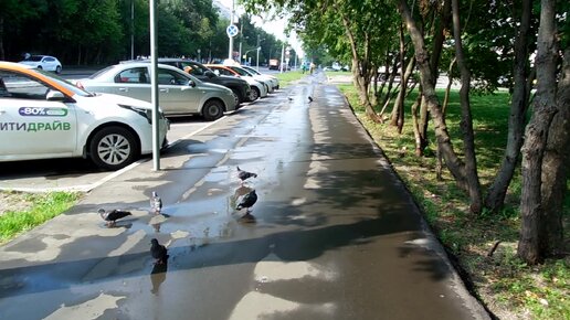 Поливалка в жару и голуби счастливы. Курорт! И романы