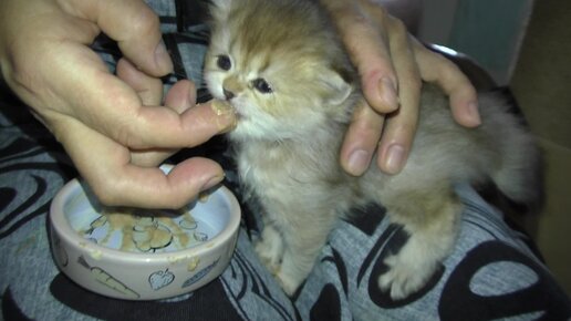 Котенок первый раз ест паштет с пальца