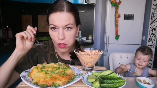 МУКБАНГ КАРТОФЕЛЬНАЯ ЗАПЕКАНКА С ФАРШЕМ, МАЛОСОЛЬНЫЕ ОГУРЧИКИ, САЛАТ/MUKBANG