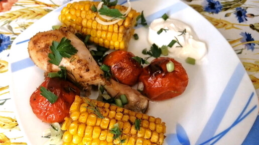 Запеченная курица с кукурузой и помидорами