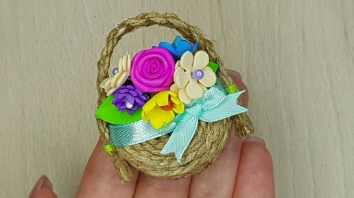 Сувенир корзинка-магнит на холодильник из пластиковой крышки и джута