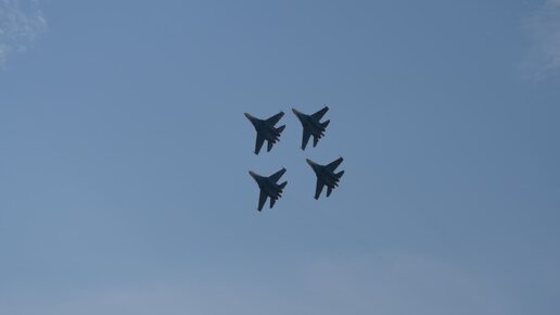Пилотаж АГВП «Русские Витязи» (4 Су-35с) на открытии форума Армия 2022. Синхронные бочки и плотный ромб.