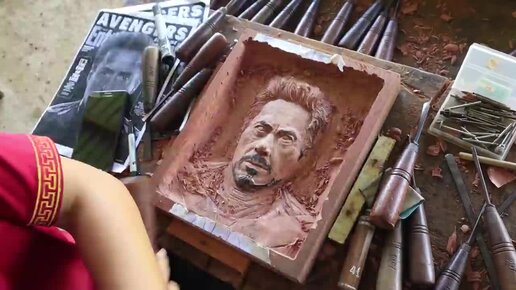 Насладитесь как вырезают лицо железного человека из дерева . Просто потрясающе