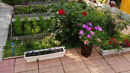 Розы, петунии, тысячелистник птармика и дельфиниумы в саду