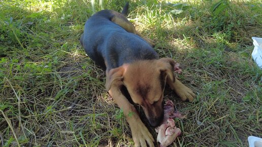 Аза и Блэк съели потрошка и принялись за сахарные косточки. 01.08.2022 года. (DJI_0949)