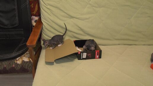 Котятки Сфинксы снова уговорили кошку-маму притащить им коробку на диван.