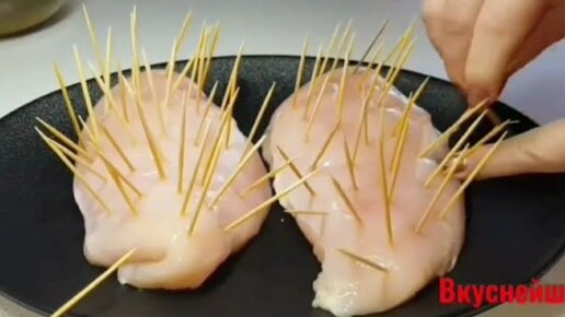 Куриную грудку прокалываю зубочистками и замачиваю в воде, получаем самое сочное и нежное мясо(делюсь рецептом)