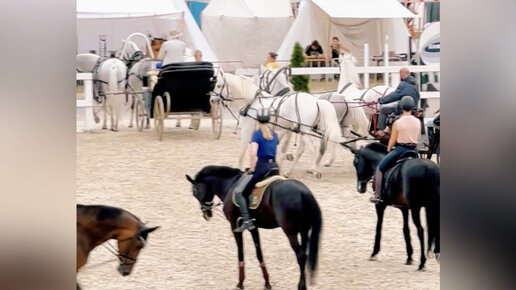 Аншлаг на разминочном плацу: две тройки лошадей и верховые