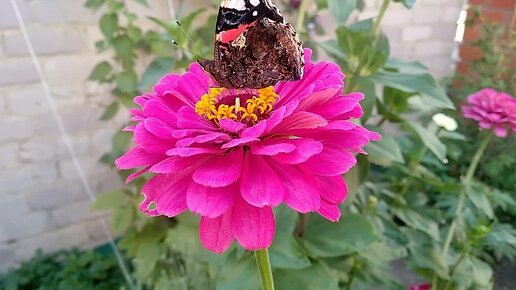 За вкусным нектаром на циннию прилетела бабочка крапивница