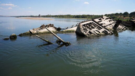 В обмелевшем Дунае из-под воды показались немецкие корабли, затопленные в 1944 году