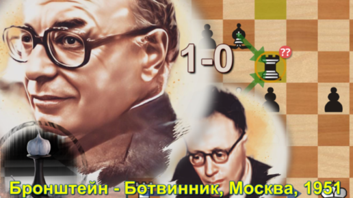Математик Давид Бронштейн белыми пересчитал великого Михаила Ботвинника в Москве, 1951: покажу партию и доигрывание до мата, 1-0