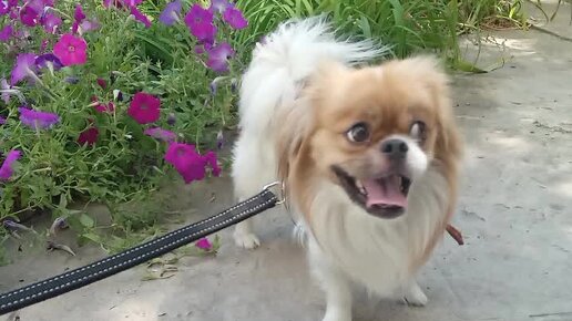 Пекинес Гуффи нюхает цветы 💐