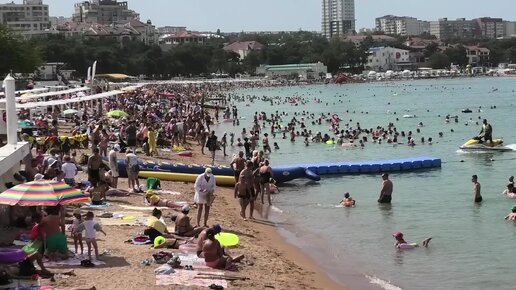 Геленджик толпы туристов Жара +33 вода +27 народ сидит в воде 22 августа 2022 года.