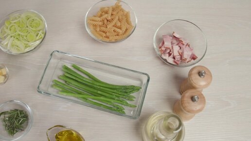 Фузилли со спаржей, беконом и соусом из лука-порей