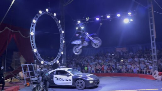 Опасный трюк! Каскадер на мотоцикле перепрыгивает через полицейскую машину!