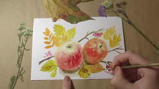 Как нарисовать простой натюрморт акварелью. Яблоки в листьях. Для начинающих