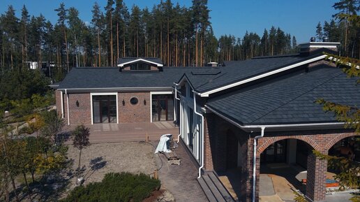 Большой дом из кирпича с ландшафтом и барбекю