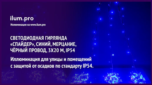 Светодиодная гирлянда «Спайдер» синего цвета, 3 по 20 м, IP54, чёрный провод, мерцание / Айлюм Про