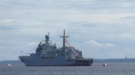 Корвет «Бо́йкий» и большой десантный корабль «Иван Грен» на Кронштадтском рейде в День ВМФ