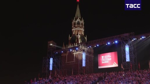 Вечернее представление XV юбилейного Международного военно-музыкального фестиваля "Спасская башня" на красной площади в Москве.